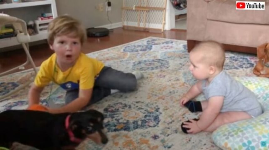 小さな弟と、ボール遊びをしている優しいお兄ちゃん。どうやらこのお宅には、わんこも2匹いるようだ。