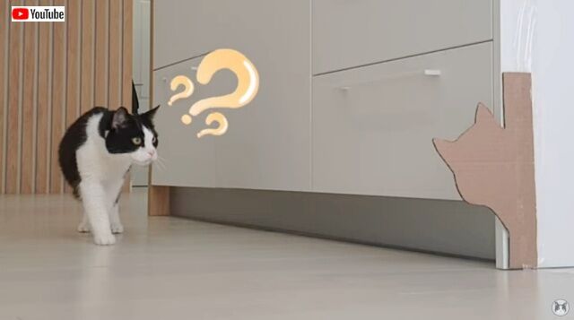 にゃんこの写真をダンボールに貼って、壁の向こうから覗かせてみた…なんていうイタズラを、かつてベラルーシの保護猫プーシクくんの飼い主さんが動画にしてた。