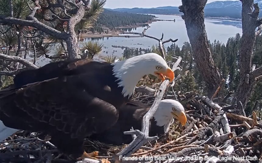 ビッグ・ベア・バレーの自然保護団体「フレンズ・オブ・ビッグ・ベア・バレー」が運営するYouTubeのライブ・カムに映し出されるハクトウワシの巣の様子を、大勢の人が固唾をのんで見守っている。