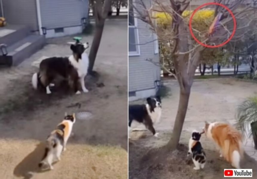 「どうしたニャ? 何してるニャ?」と、1匹の猫がすたたたたっと駆けてきた先には、木の上を見つめるわんこたちが。