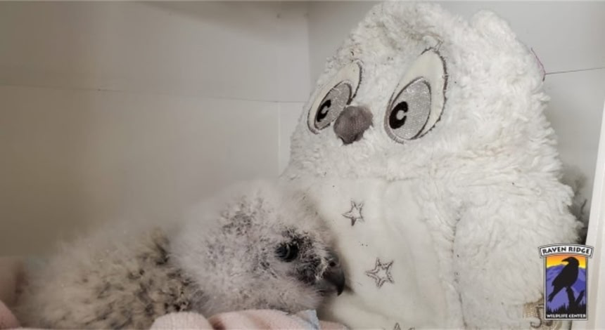 野生に返すことを前提でヒナをしばらく育てなければならない。スタッフが白いフクロウ型のぬいぐるみを与えたところ、ヒナはその身をゆだねて愛情を示したという。