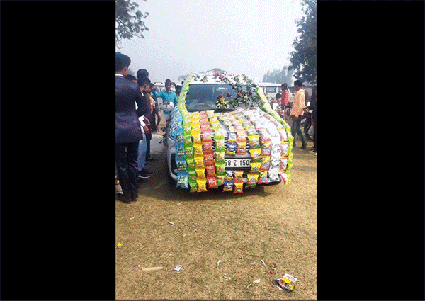 様々な試行錯誤が繰り広げられている中、最近SNSで話題となっていたのは、スナック菓子で全面を覆ったウエディングカーだ。