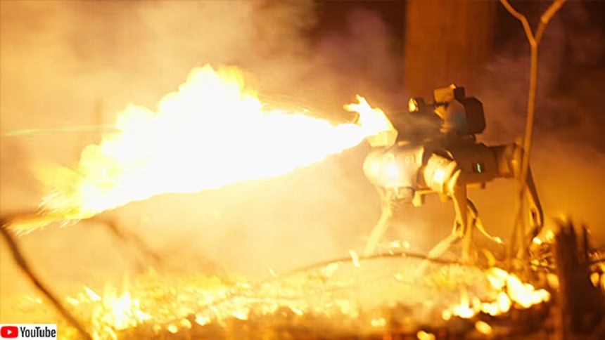 この四足歩行ロボットは ARC Flamethrower と連動しており、オンデマンドでどこにでも火を放つことができます!