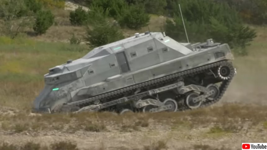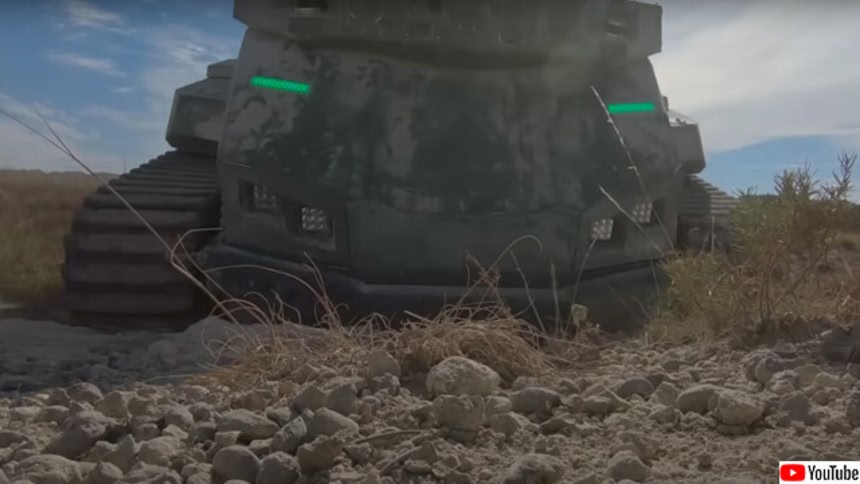 オフロードを自律走行。緑に光るライトがある戦車
