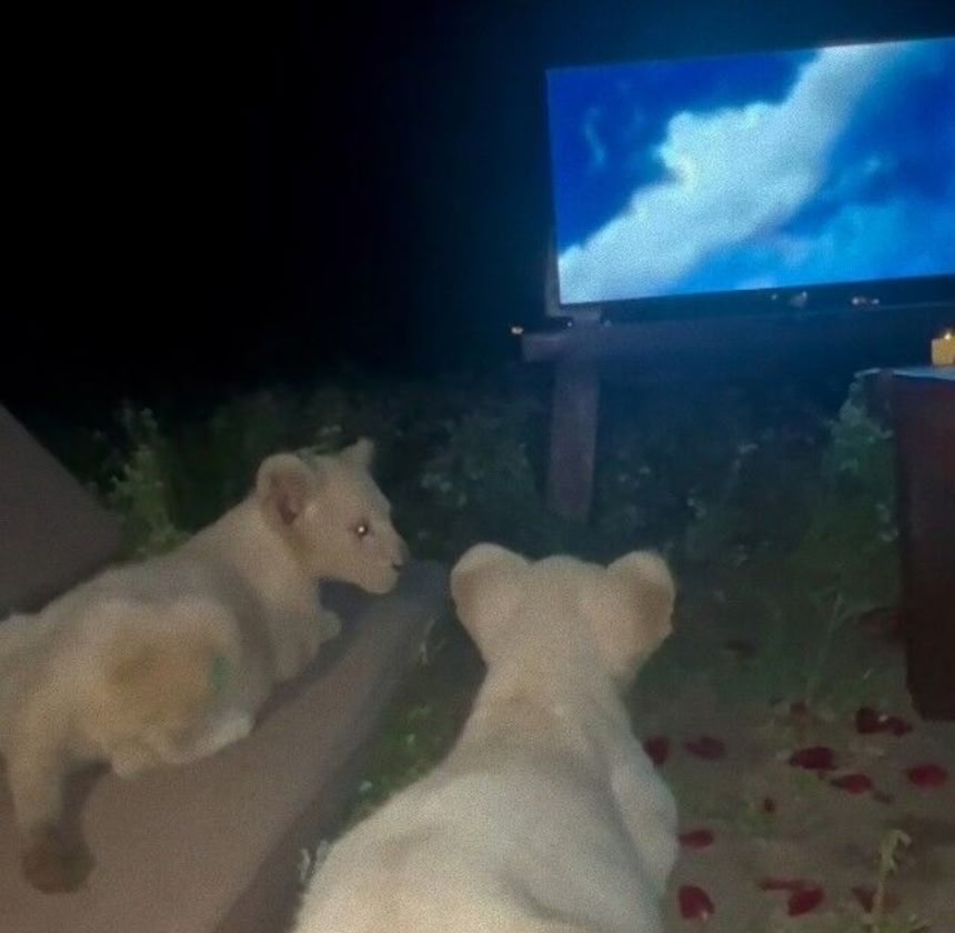 2頭のライオンが、テレビの画面に映し出されるライオンキングを鑑賞中。