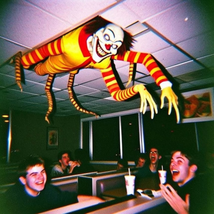 化け物になったドナルドの大きな模型を壁や天井に取り付けて夜間暗い店内で開催してるイベントの画像かむしろ客の方が怪異的な存在であるって画像に見える。