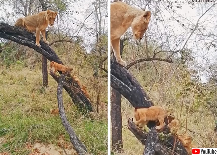 この日、ライオンのお母さんが4頭の子供たちに木の登り方を教えていた。それはとてもやさしく、愛情あふれる方法だった。