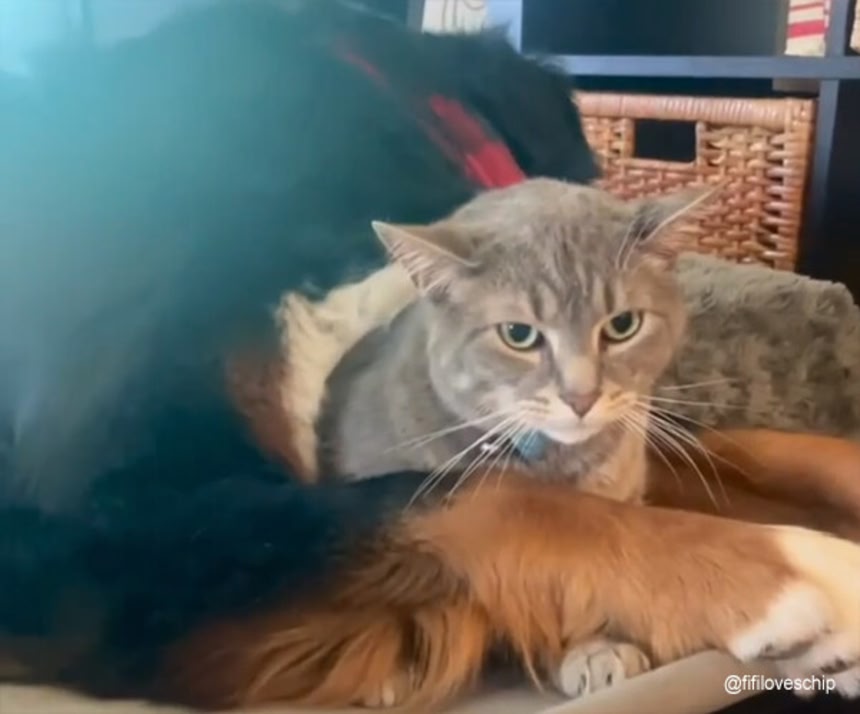 バーニーズ・マウンテン・ドッグのメス、フィフィは、一緒に飼われている猫のチッピーのことが大好きだ。