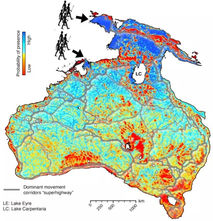この画像を大きなサイズで見るこのモデルによると、カーペンタリア湖の東側、エア湖の南側の回廊、内陸部を横断する回廊など、現在「スーパーハイウェイ」と呼ばれている既知の先住民の移動ルート近くに、当時から人がいた可能性が高いことを示している。