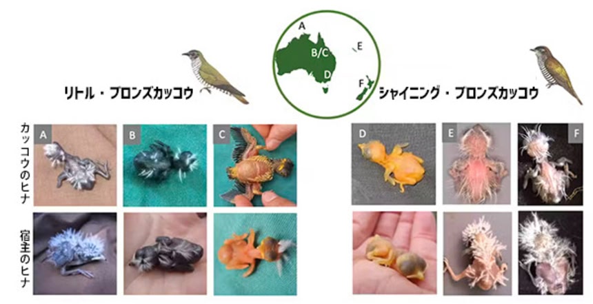 このようなカッコウの擬態は、さらに精妙な適応をすることになる。驚いたことに、同じブロンズカッコウでも、利用できる鳥によってヒナの姿が違うのだ。