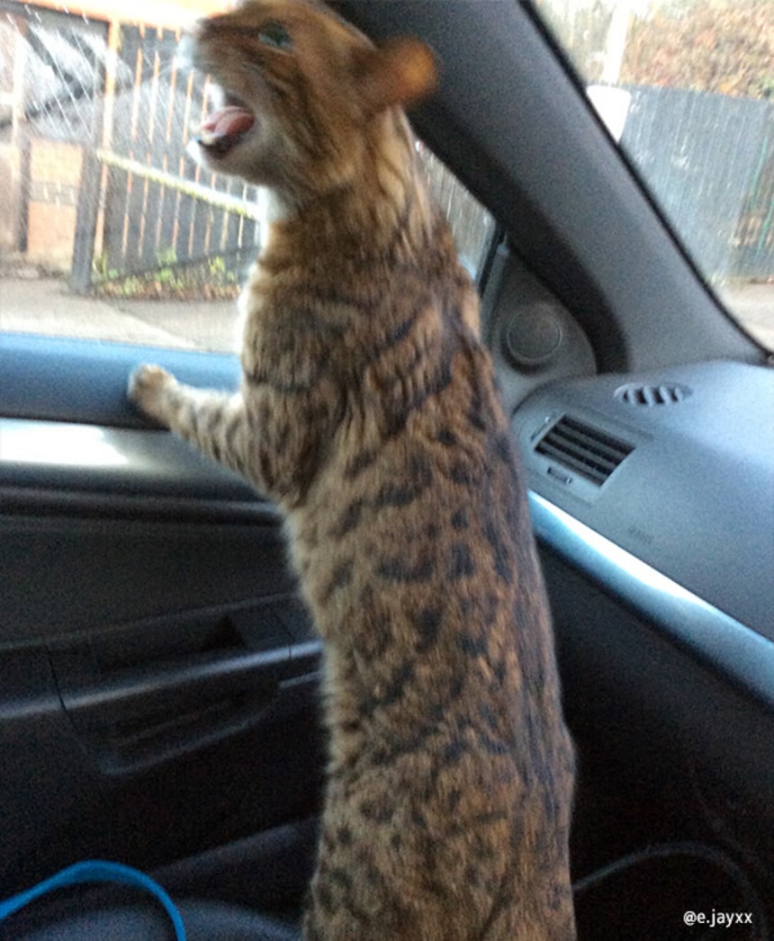 だが猫は明らかに助けを求めている兆候はなく、どちらかというと「何してくれちゃってんの、はよ車から降ろせ」とでも言いたげに、鳴き声を上げている。