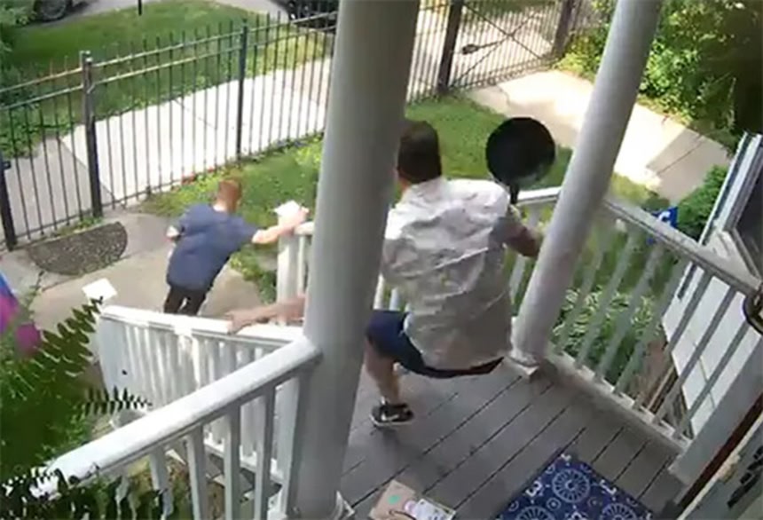 そこで空き巣が2階から降りてきたところを目撃し、直接対峙した。彼はフライパンを手に持ちながら侵入者を家の外まで追いかけていった。