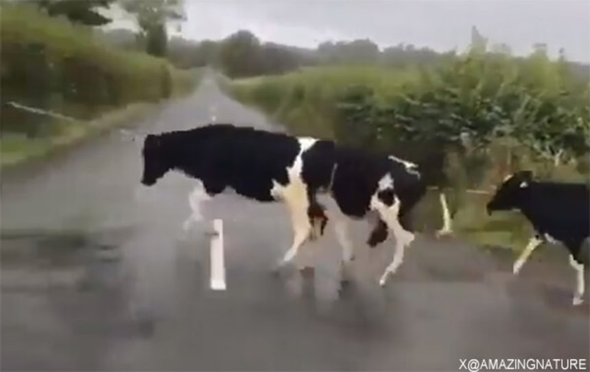 牛たちは白線を避け、踏まないようにジャンプしながら横断しているのだ。