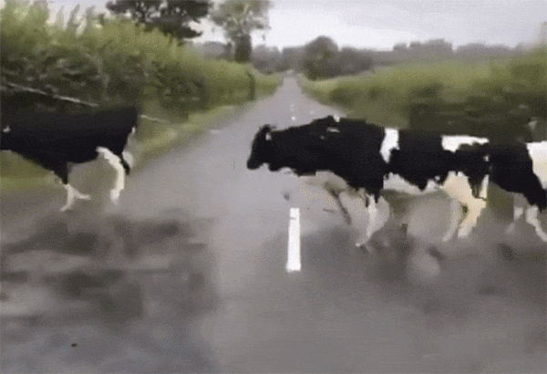 道路を横断中の牛の群れだが、中央の白線のある場所では、絶対に踏まないようにジャンプする。それが1頭だけではなく全員なのだ。