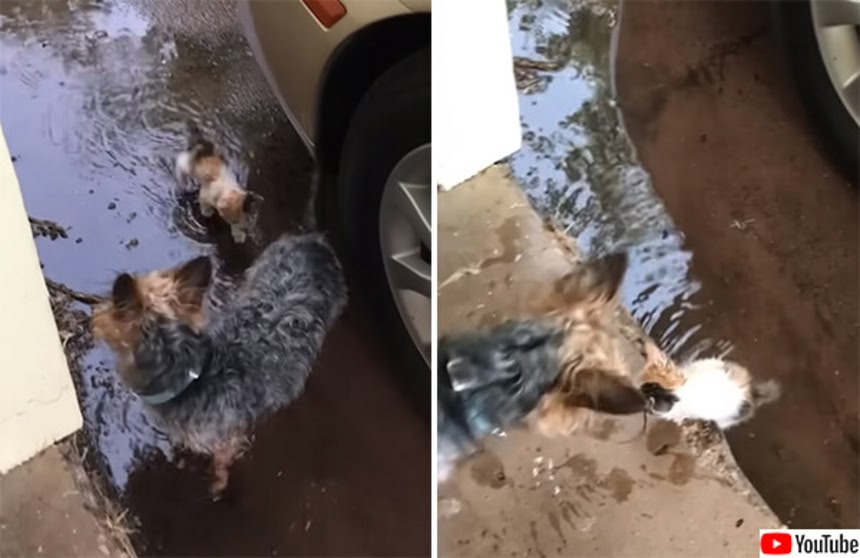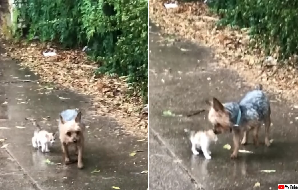 降りしきる雨の中、びしょ濡れになっている子猫を発見した小型犬は、その猫を励ましながら自分についてくるように促し、自宅へと招いた。