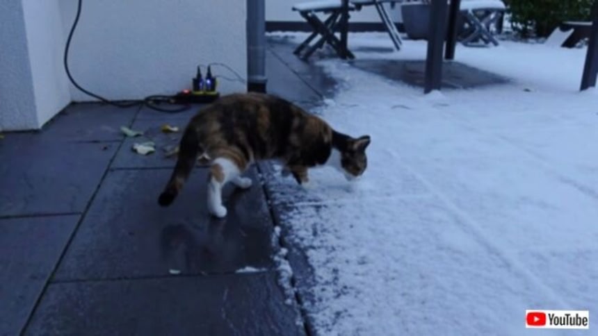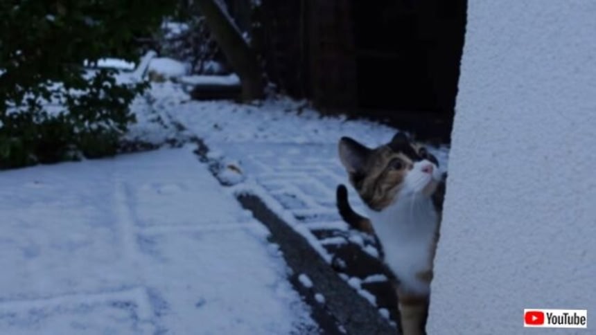 猫のネリーさんは現在生後6か月。生まれて初めて見る雪に、興味津々みたいだ。庭へ続くドアを開けてもらって、さあ、冒険が始まるよ!