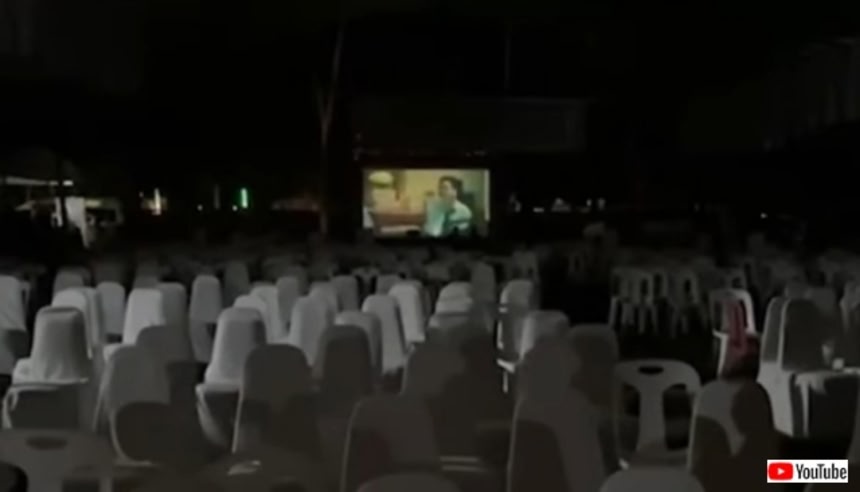ここはタイ東北部のナコーンラーチャシーマー県にある中国人墓地である。真っ暗な中、スクリーンの前に、空っぽの椅子がずらりと並んでいる。