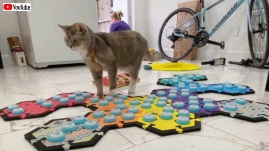 この画像を大きなサイズで見るサウンドボードを使って、ニンゲンと意思の疎通を図るかしこい猫のビリさん。今日は外に出たい気分だったみたいなんだ。早速ご主人がドアを開けてくれたんだけど…。