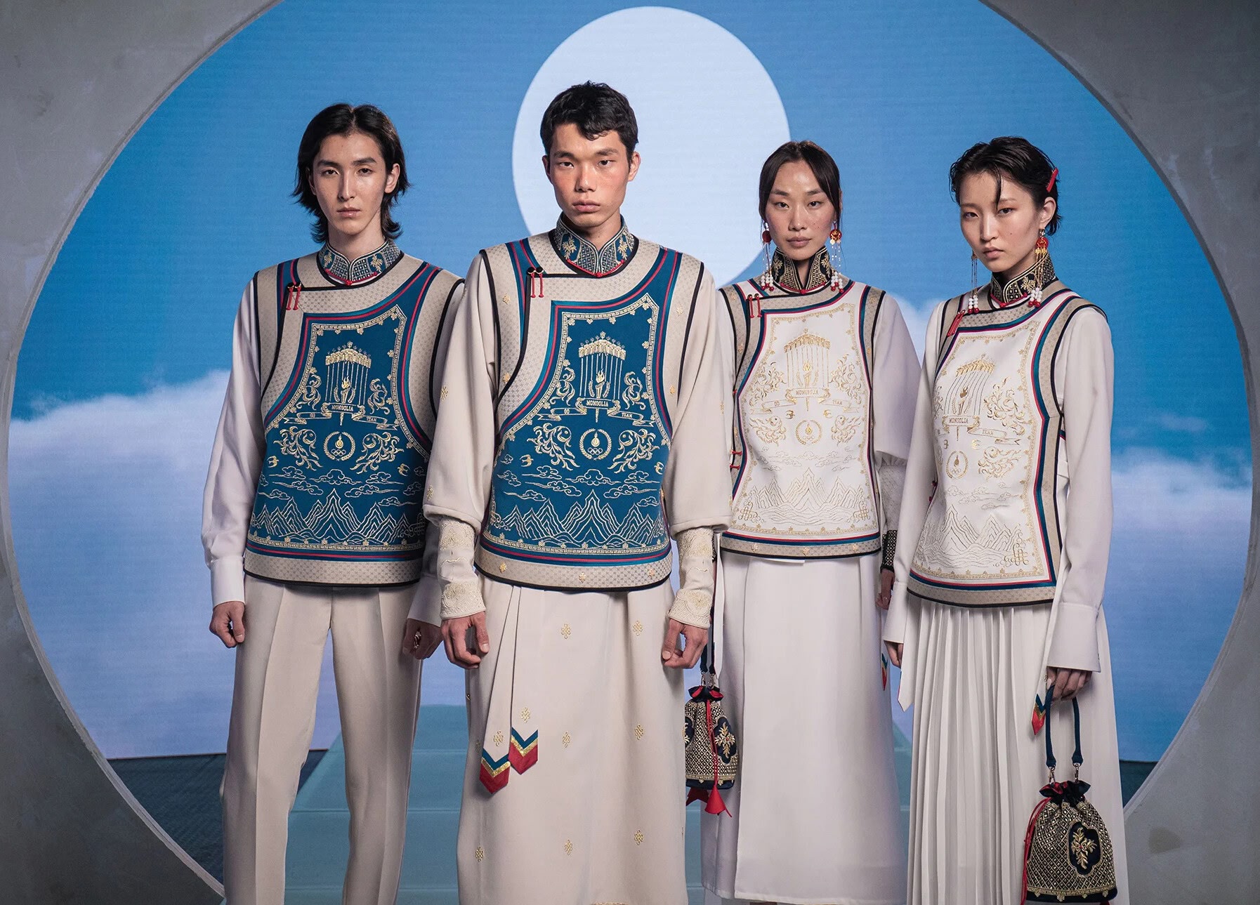 手がけたのはモンゴルの首都を拠点とするクチュールブランド「ミシェル&アマゾンカ(Michel&Amazonka)」。遠目にもモンゴルの伝統衣裳とわかるデザイン。なのにどこか今どきな雰囲気が漂うところが印象的だ。