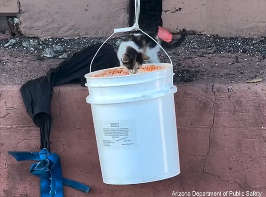 ロープで結んだバケツの中にクッションになるようなものを入れ、警官が猫のいる場所に垂らしたところ、猫は興味深そうにバケツの中の匂いをクンクンと嗅ぎ始めた。