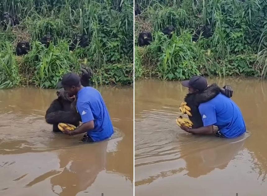 保護区の島で恩人と何度も抱擁を交わすチンパンジー