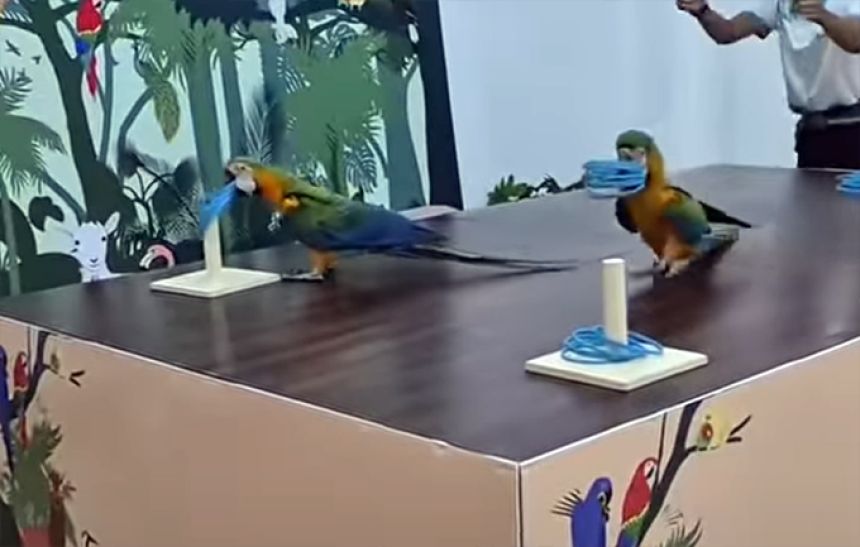青い輪っかを棒に通すというルールのもと、2羽のコンゴウインコがスピードと器用さを競い合っていた。
