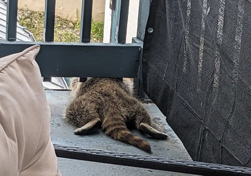 最近、ある民家の飼い猫が何かの匂いに気が付き、2階のバルコニーに向かっていった。その様子に気が付いた住人が窓の外からバルコニーの様子を見たところ、なんとプランターの台の下で仰向けになって気持ちよさそうにアライグマが寝ていたのだ。