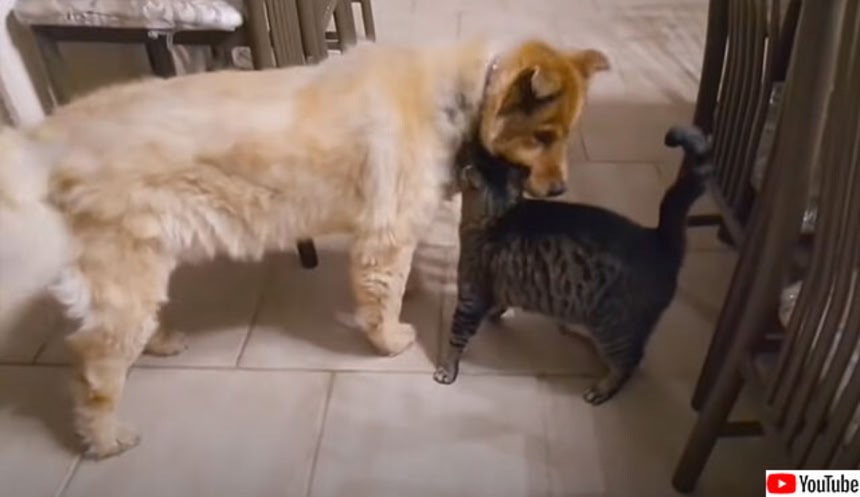 盲目のゴールデンに寄り添う片目の見えない猫