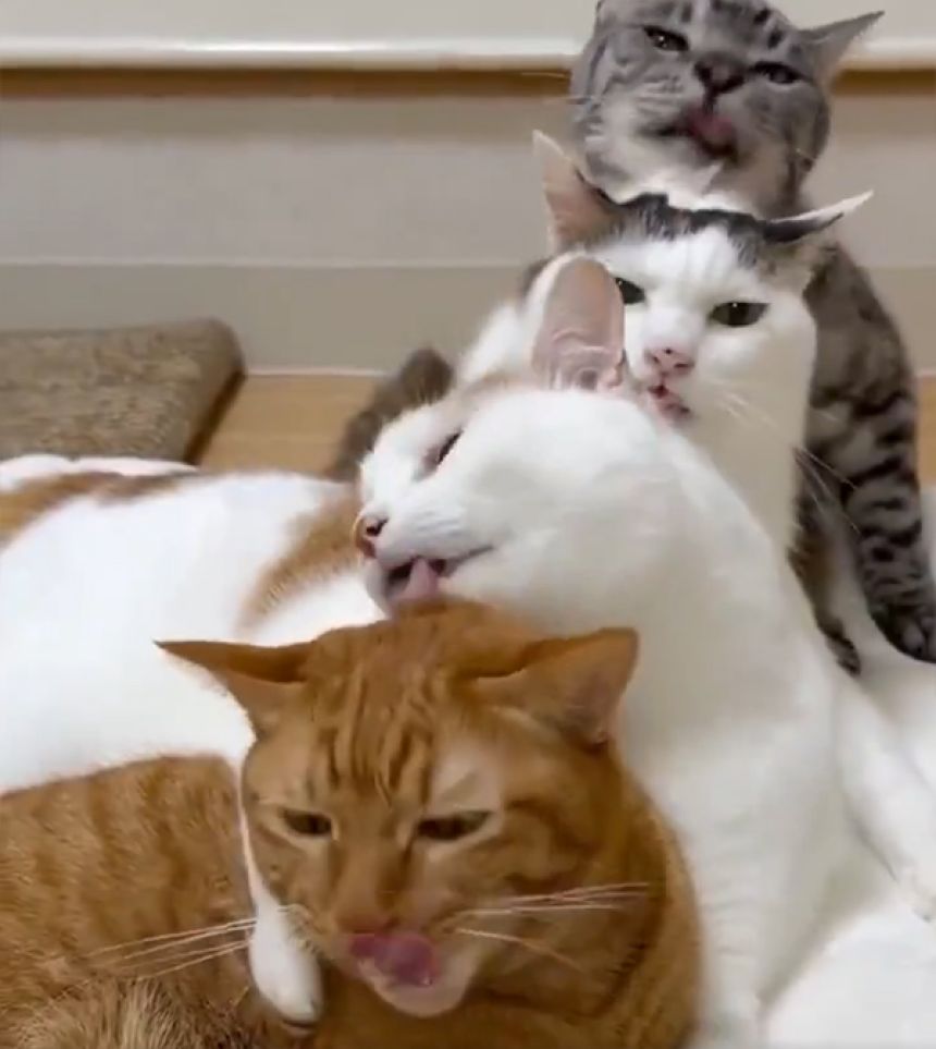 今回のような複数の猫が同時に舐め合う行動は、そこまで珍しい行動ではない。これは群れの中での“つながりの強さ”を示すもので、信頼関係のネットワークが可視化されたような状態だといえる。