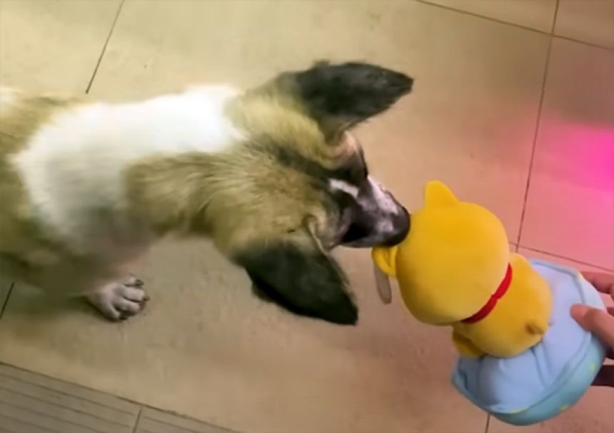 クンクンとにおいを嗅いだ後、口にくわえ、うれしそうにそのぬいぐるみで遊び始めた。