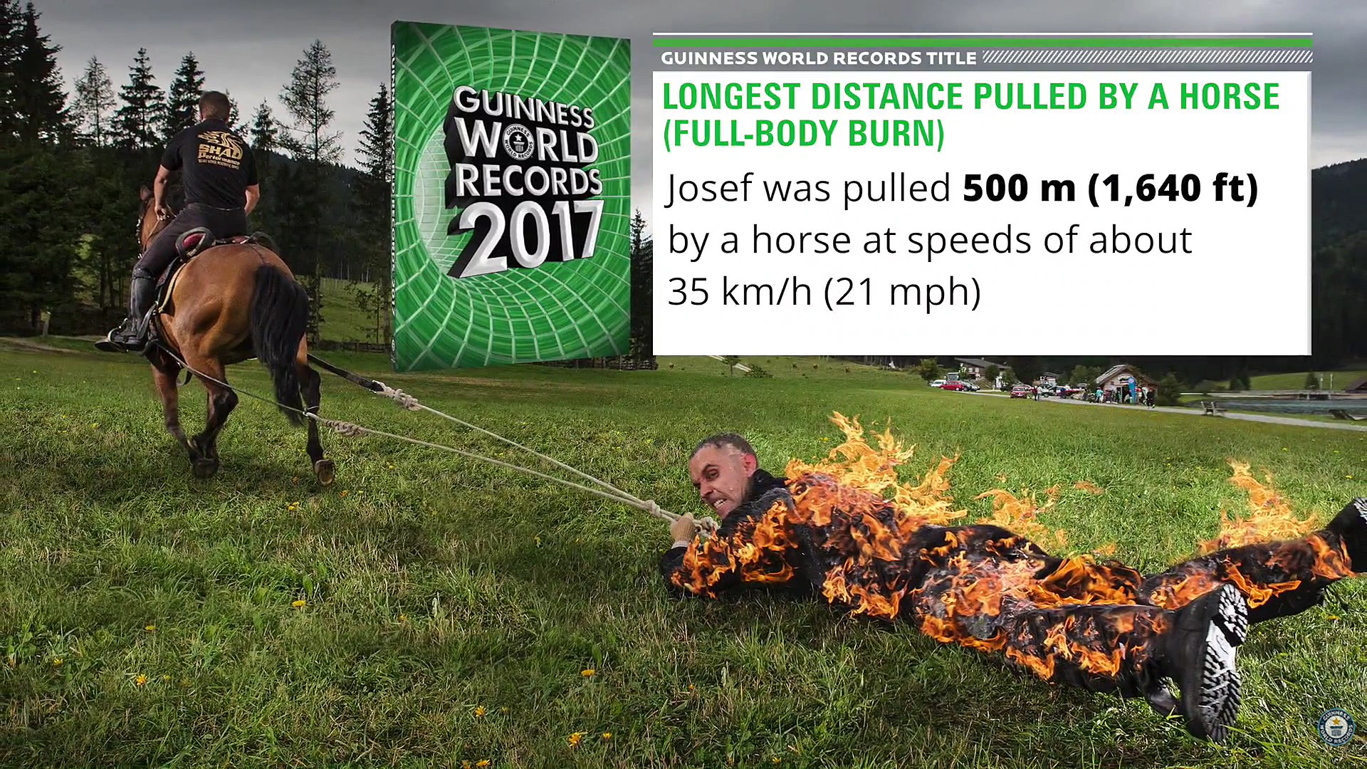 2017年には「全身が燃えたまま馬に引かれ続けた距離の最長記録:500m」、さらに「全身が燃えたまま、車両による牽引の最長距離記録:合計約582m」、その後も自転車やジップワイヤーを使った”全身炎上”系ギネス記録を次々更新中だ。