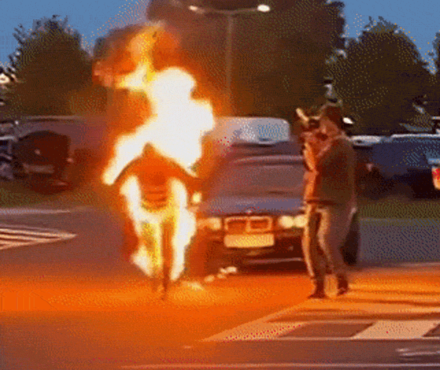 この画像を大きなサイズで見るメラメラ燃える炎に包まれたまま前進する”命知らず”のヨーゼフ・トードリングさん。しかもよく見ると燃えたまま、ひも付きのハーネスで自動車まで引いている。
