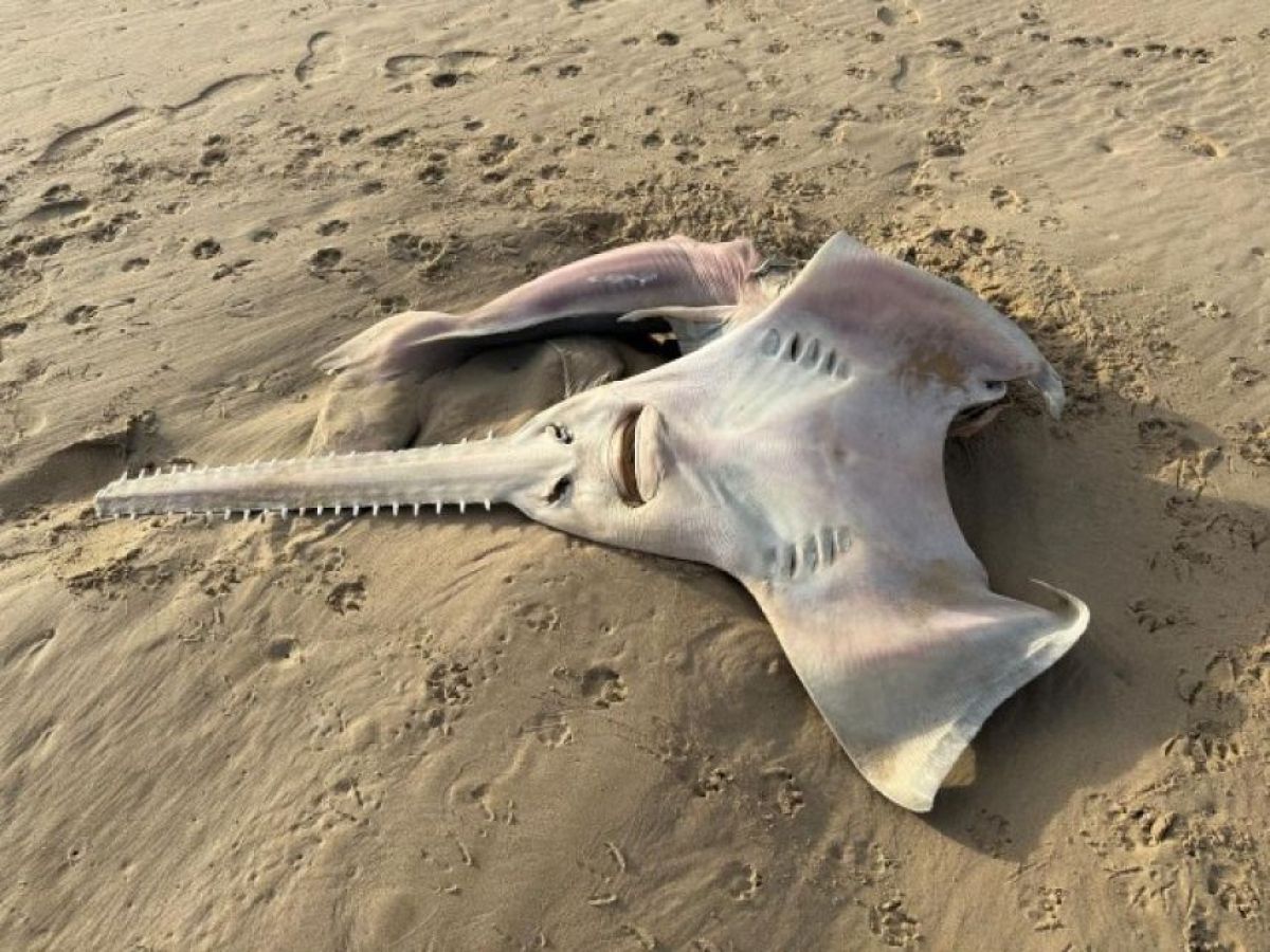 この画像を大きなサイズで見る2025年9月19日の朝、南アフリカ東ケープ州ビルハ川の河口の砂浜に、オオノコギリエイが打ち上げられた。体長は2.93mほどで、まるで巨大なギターのようだ。