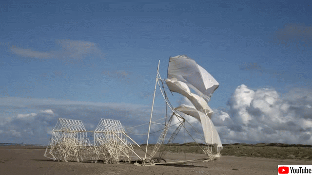 ストランド・ビーストはプラスチック・チューブや塩ビ管、キャンバス地などで作られた、風の力でまるで生き物のように動くキネティックな「人工生命」である。