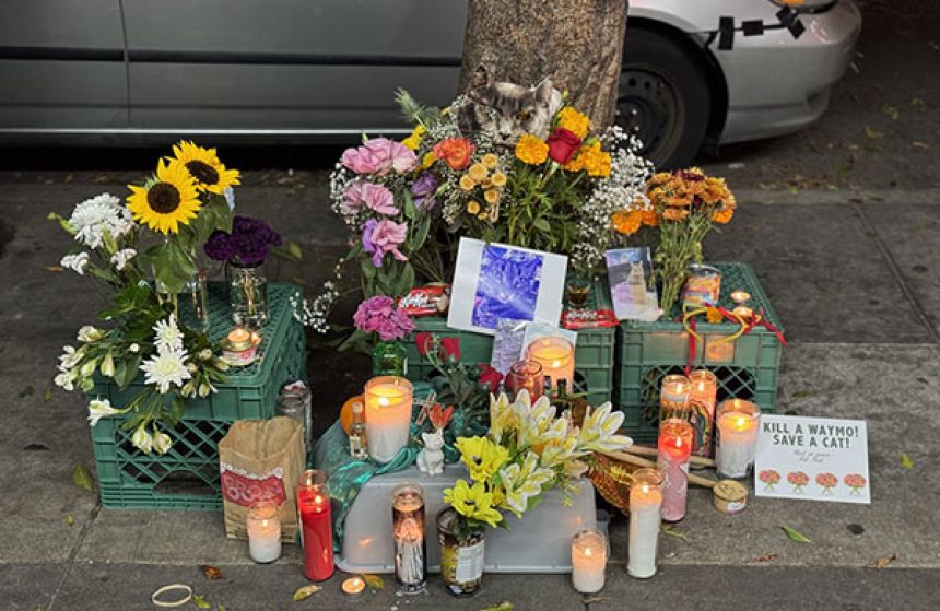 花とキャンドルに囲まれた献花台の一角には、手書きのプラカードがあり、 「ウェイモを止めろ! 猫を守れ!」、 「キラー・カーを止めろ!殺猫ロボットはいらない!」などと書かれていた。