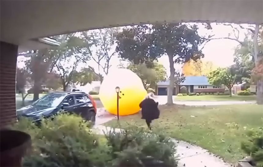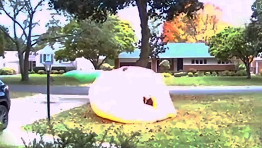 アメリカ・ミシガン州の住宅街で、巨大な風船カボチャが強風に吹き飛ばされるという珍事件が起きた。