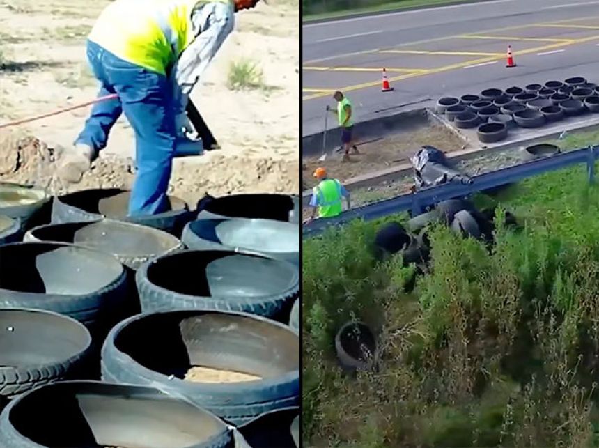 完成した道路は一見するとごく普通の高速道路に見えるが、その実は、何千本もの古タイヤの上に成り立っているのである。