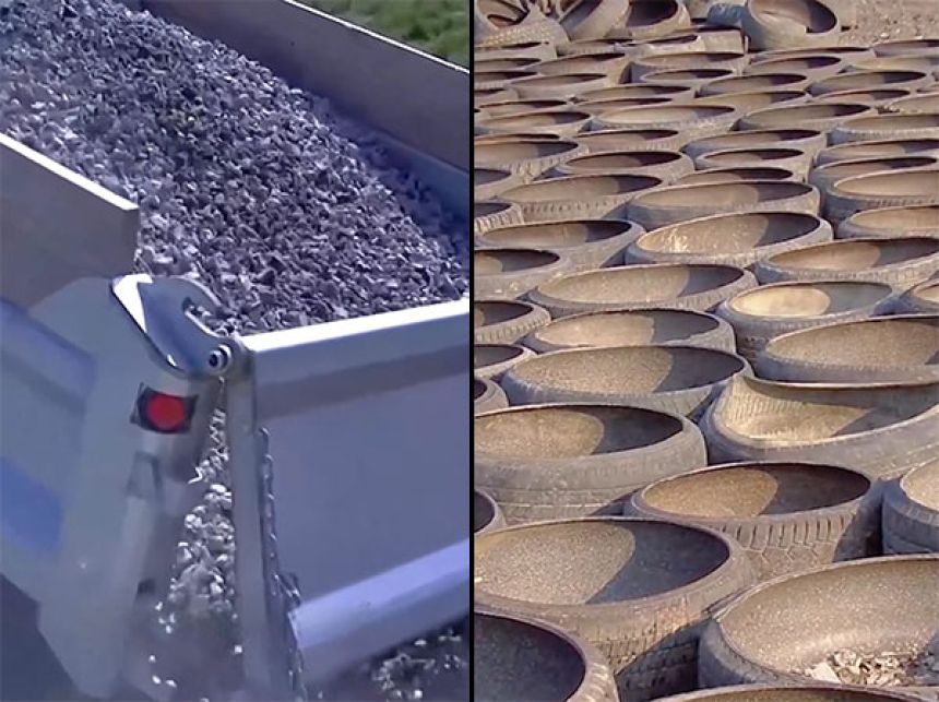 タイヤという廃棄物を利用することで、通常なら採掘して運んでこなければならない新しい石や砂利などの建設資材を、ほぼ半分に減らすことができる。