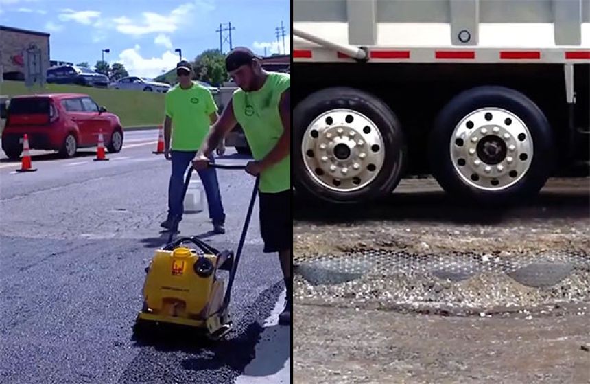 Confined Aggregate Concreteと呼ばれる2016年に発明された方法で、固定したタイヤとタイヤ同士の隙間に砕石を詰め込む事で、通過する車両の重みで潰れて砕石が徐々に横方向へと拡がってしまうのをタイヤにより物理的に防ぎ、結果として道路が陥没しにくくなるという事らしい。