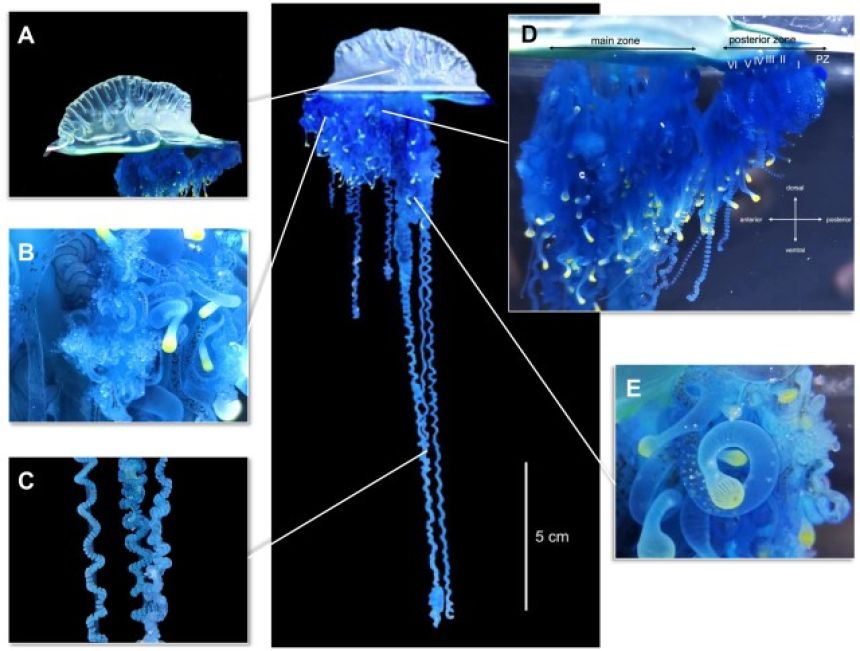 研究チームは宮城県・仙台湾の海岸に打ち上げられた個体を採集し、浮袋の大きさや形、触手や個虫の配置など、群体を構成する各部位の特徴を、既知のカツオノエボシ属と比較した。