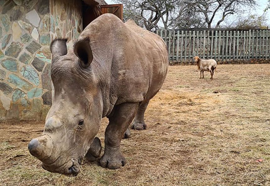 夜間、羊たちはサイと一緒に囲いに入れられ、サイに寄り添って眠ることで安心感を与えている。