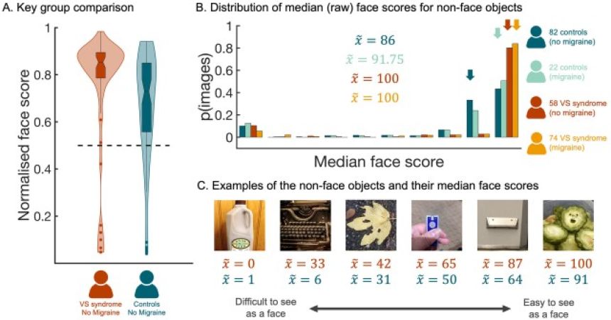 その結果、ビジュアルスノウ症候群の人は、対照群に比べて一貫して高い「顔らしさ」を感じる傾向があったという。