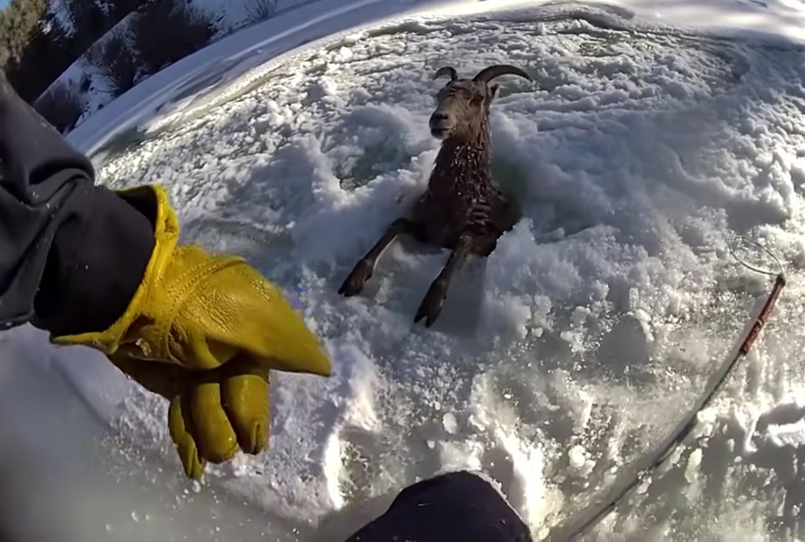 凍った川で水に落ちたビッグホーンシープを発見