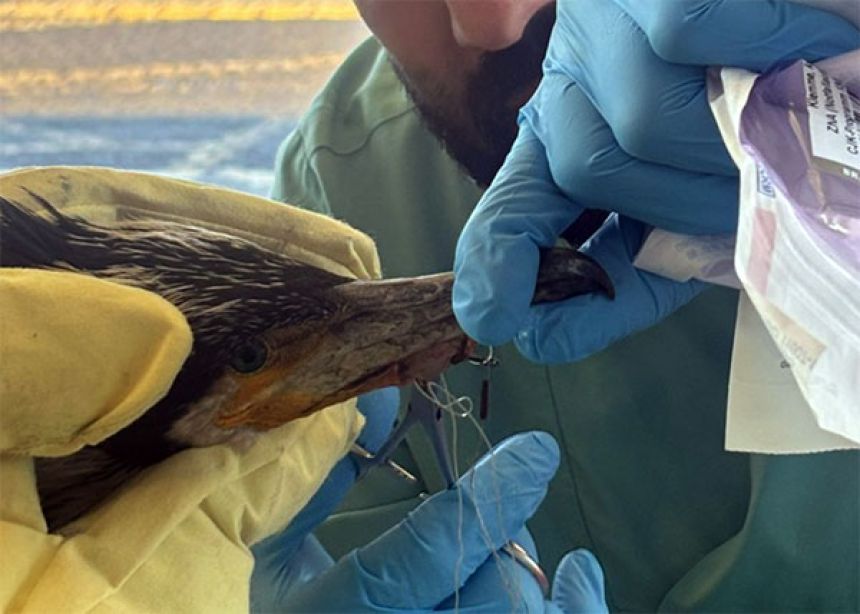 この鳥はカワウで、そのくちばしには、金属製の釣り針が深く刺さっていた。
