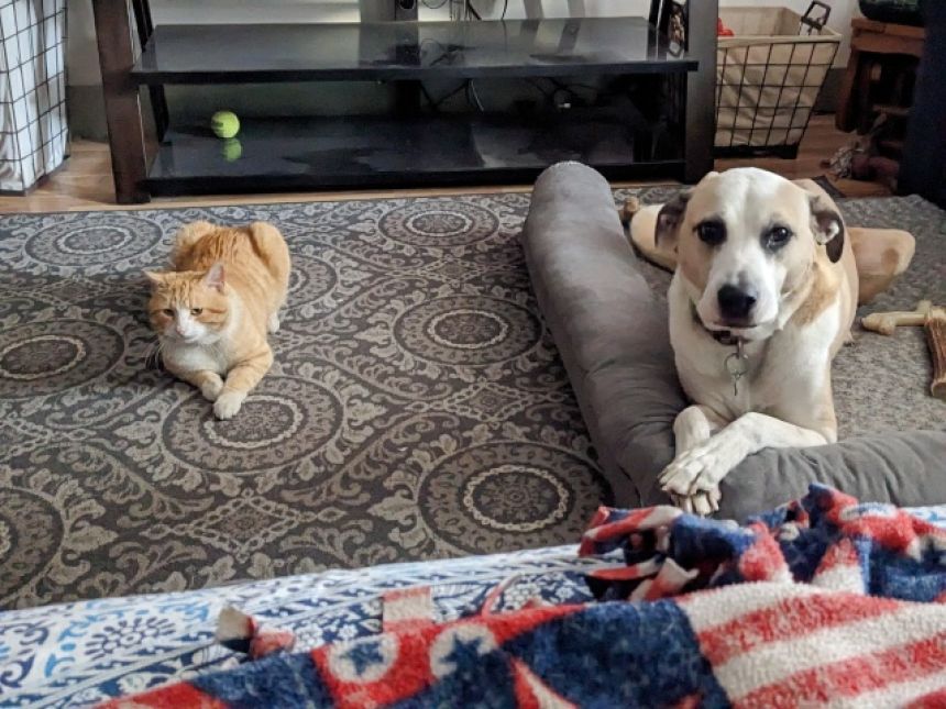 こう語るAdventurerinmymindさん宅では、先住犬のジャックと猫のトニーがまったく同じポークで写真に納まっていた。