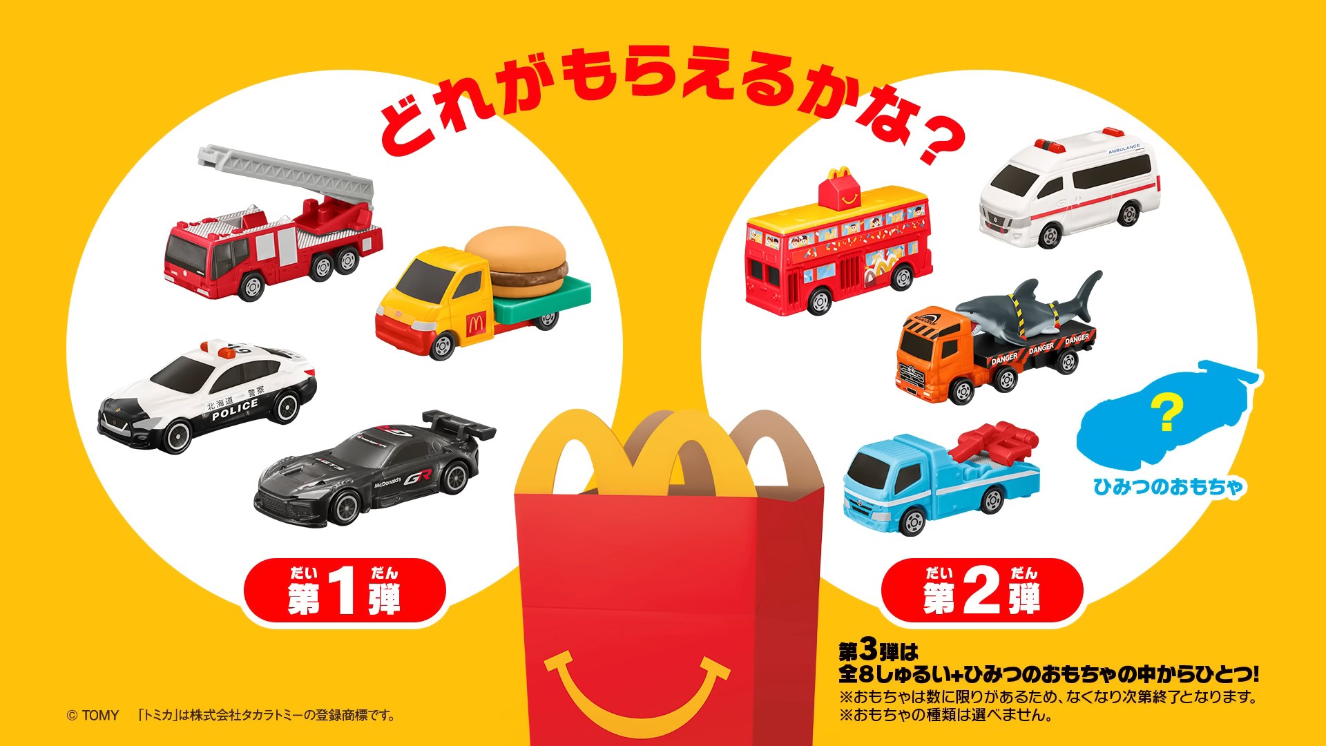販売エリアは、全国のマクドナルド店舗(一部店舗を除く)で、付属するおもちゃの種類は大きく分けて2つ。「トミカ」と「サンリオキャラクターズ」だ。