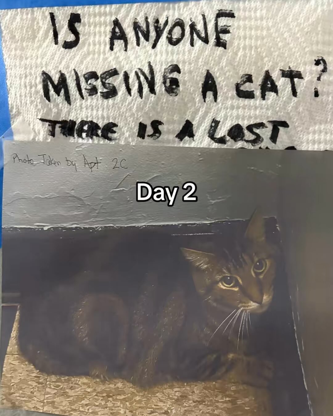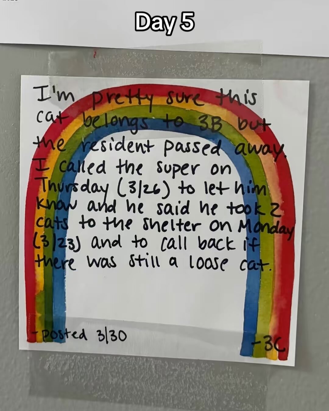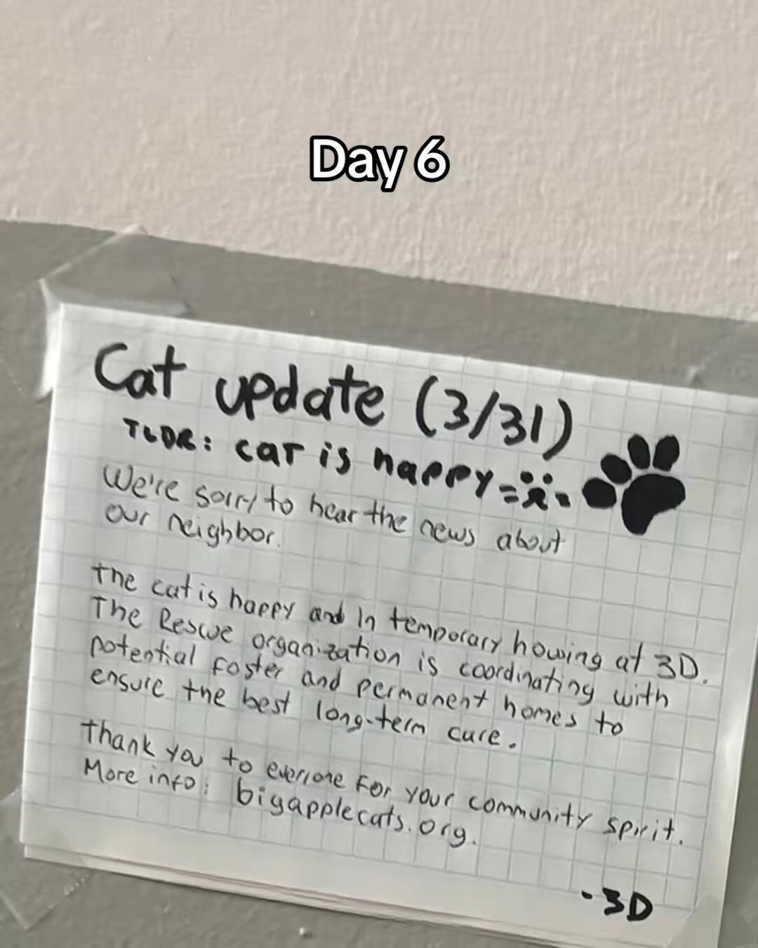 彼らはロビーの掲示板に貼ったメッセージで情報を交換し合い、最終的に猫は住人の1人に引き取られた。