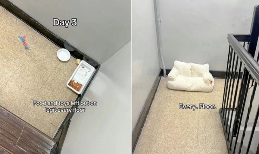 階段の踊り場には餌と水が用意され、居心地の良いベッドまで置かれていた。アパートの住人たちが総出で猫を気遣い、何とか助けようとしていたのだ。