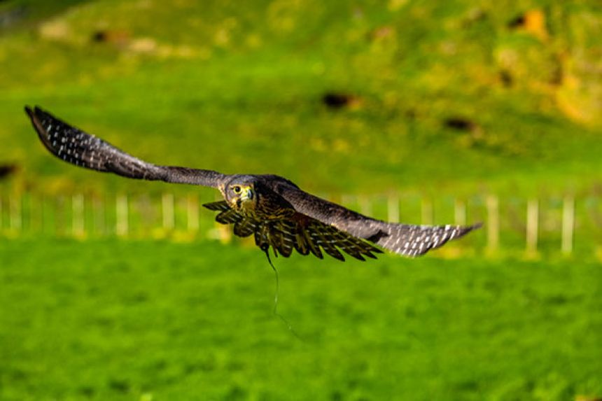 ニュージーランドハヤブサの翼開長は最大95cmほどで、最高時速200kmで飛ぶ俊敏な猛禽類だ。