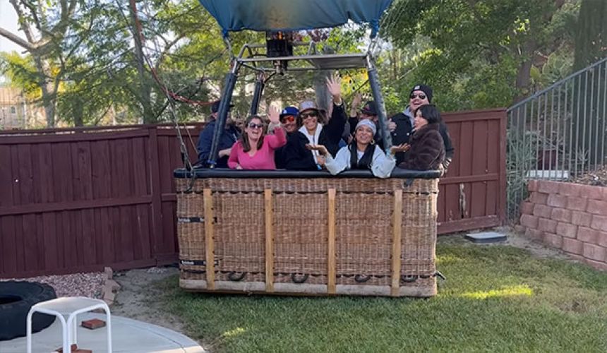 ペリンさんと妻のジェナさんが慌ててガラス窓を開けて裏庭に出ると、そこには13人もの乗客を乗せた巨大な熱気球がしっかりと着地しているではないか!
